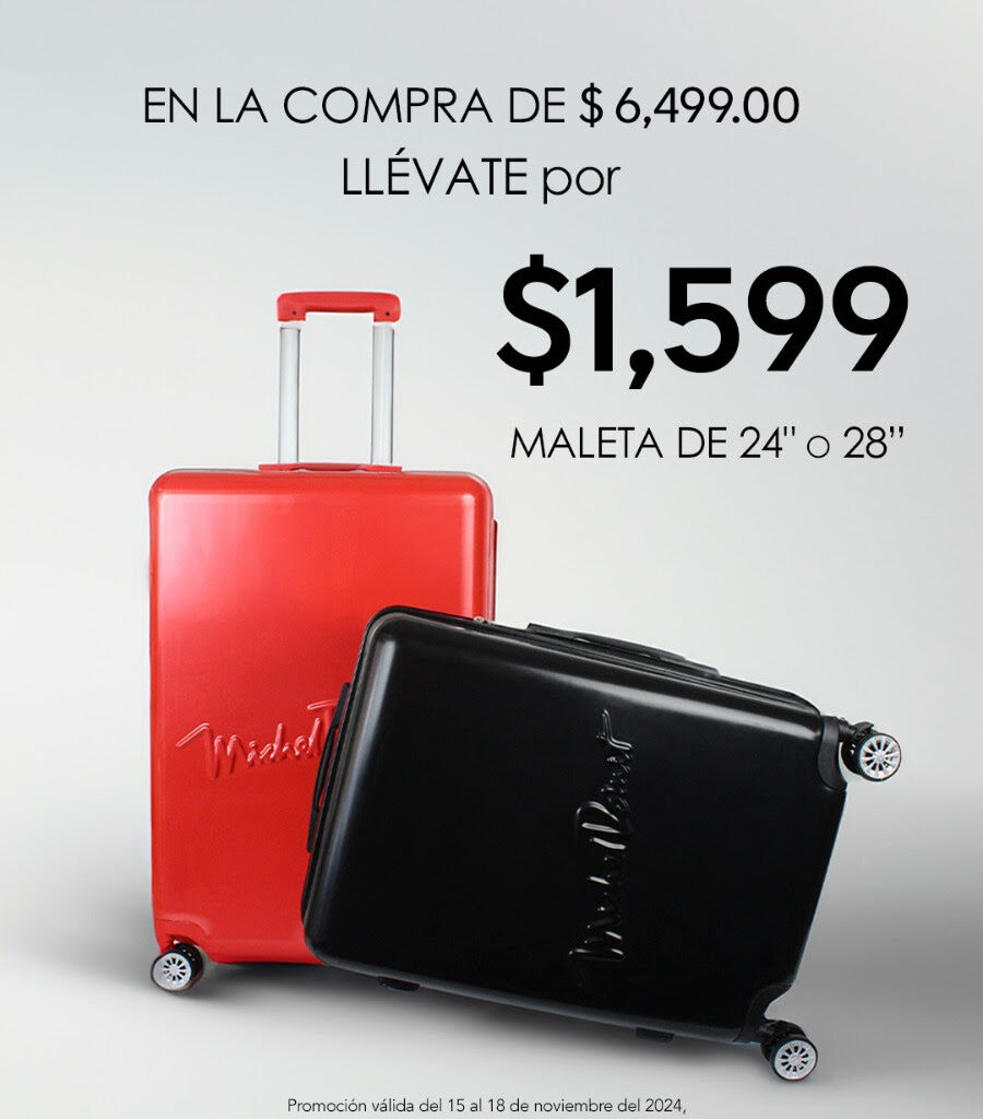 Aprovecha la promoción de Michel Domit y en compras superiores a $6,499 MXN llévate por $1,599 MXN una maleta. Perfectas para las próximas vacaciones, son un regalo ideal para los viajeros frecuentes.
