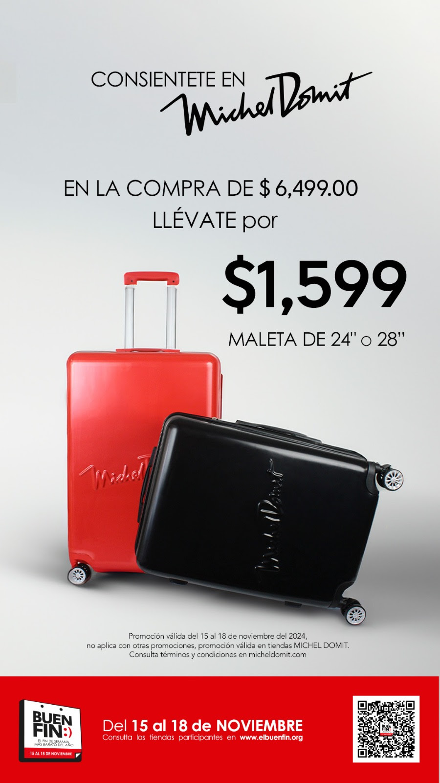Aprovecha la promoción de Michel Domit y en compras superiores a $6,499 MXN llévate por $1,599 MXN una maleta. Perfectas para las próximas vacaciones, son un regalo ideal para los viajeros frecuentes.