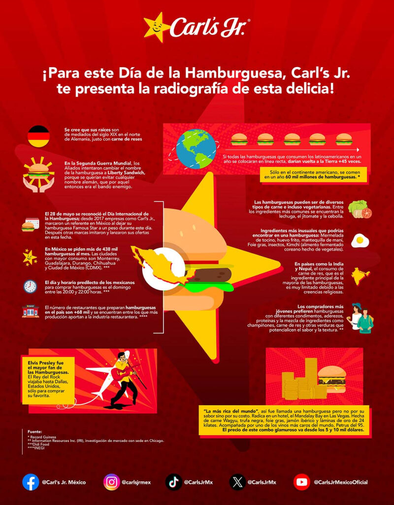 2024 es un año importante para la marca y hoy estamos muy contentos de haber sido los pioneros en establecer el 28 de mayo como el Día de la Hamburguesa, logrando que sea una fecha icónica de Carl´s Jr., y que ha hecho que nuestros invitados esperen con ansias el día para ir por su Famous Star a $1 peso. Estamos preparados para recibir a los fans de nuestras hamburguesas y celebrar como se debe el Burger Day”.