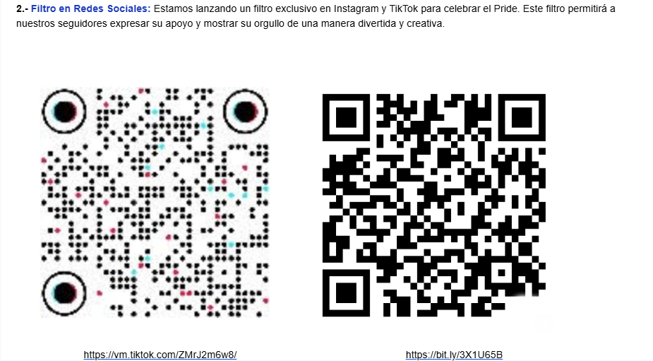 2.- Filtro en Redes Sociales: Estamos lanzando un filtro exclusivo en Instagram y TikTok para celebrar el Pride. Este filtro permitirá a nuestros seguidores expresar su apoyo y mostrar su orgullo de una manera divertida y creativa.