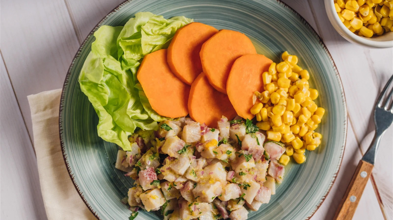 - Sirve el ceviche con hojas de lechuga, camote y maíz dulce como acompañamiento.