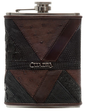 Licorera forrada en un diseño de patchwork pintada a mano en piel genuina de avestruz y lizard.