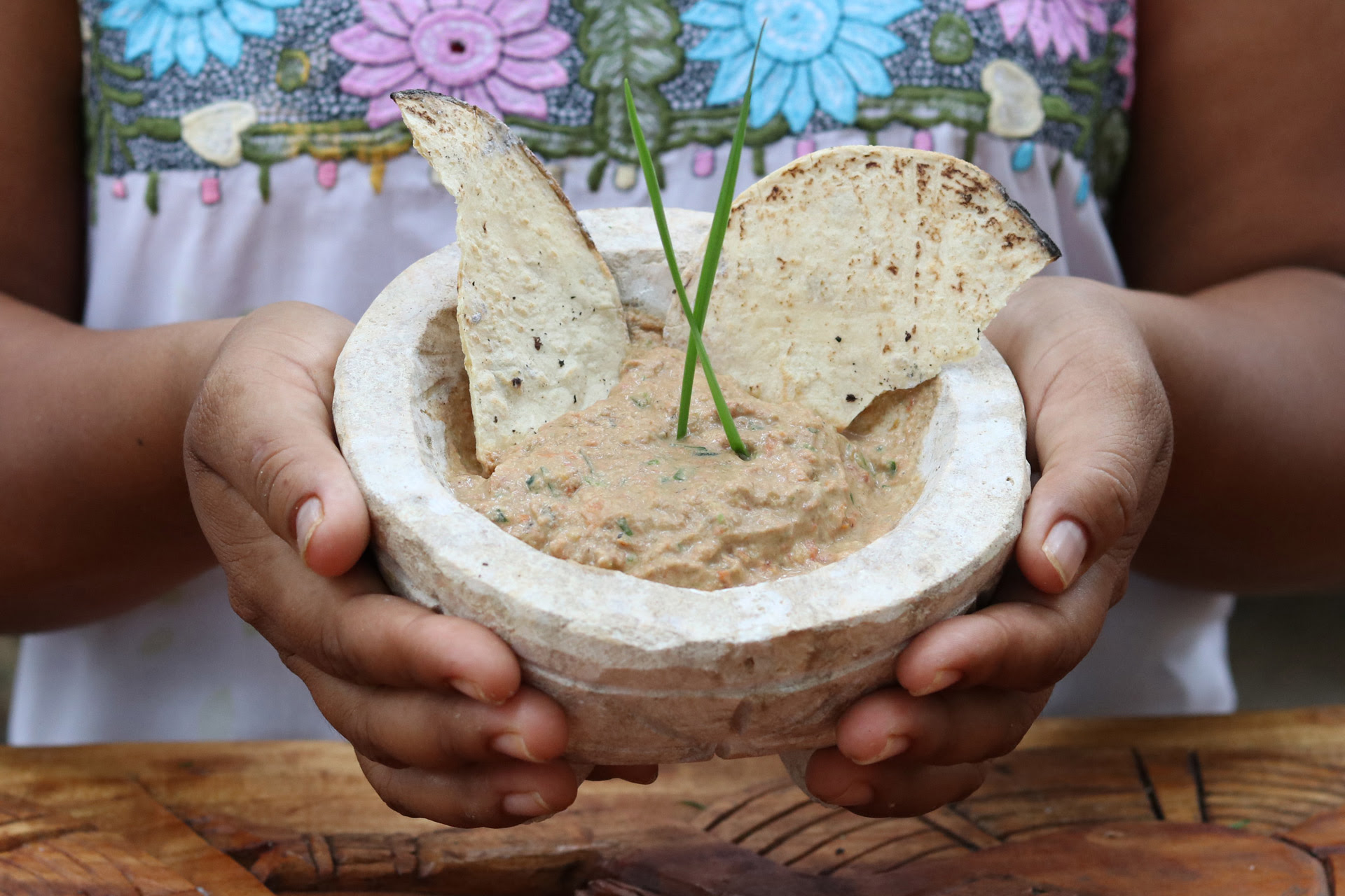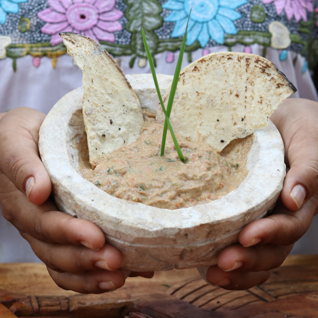 El sikil pak es una botana propia de la gastronomía yucateca, sumamente popular y delicioso, este “dip” utiliza ingredientes como la pepita de calabaza molida, el tomate rojo, chiles verdes, cebollín y cilantro, que le dan un aroma apetitoso mientras se disfruta al centro con totopos de maíz.