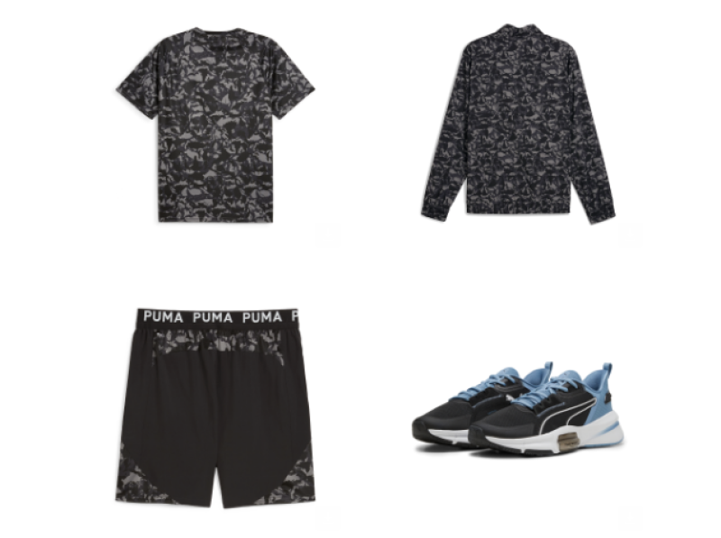PUMA FIT también está disponible para hombres que les gusta ejercitarse, incluye una tee, short y jacket con estampado de tipo camuflaje en tonos negros con gris, que otorgan una apariencia tipo militar. Esta fusión no sólo proyecta agilidad, sino también garantiza un ajuste y soporte óptimo para cualquier actividad. El sneaker PWRFrame TR 3 se hace presente también para ellos en color negro con pops en azul haciéndolo más llamativo, se adapta al pie y ofrece una respuesta rápida, gracias a su avanzada tecnología de amortiguación y arranque que ayudará a alcanzar el máximo rendimiento en cada paso.