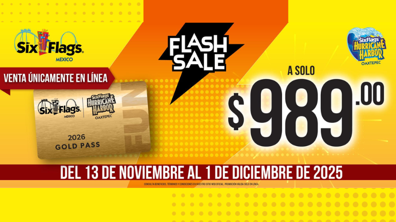 Six Flags México anunció una de sus promociones más atractivas del año: la Flash Sale 2025, disponible del 13 de noviembre al 1 de diciembre, con la que los visitantes podrán adquirir el Pase Anual 2026 por solo $989 MXN, una tarifa excepcional para disfrutar del resto de 2025 y todo el calendario de festivales y experiencias del próximo año.