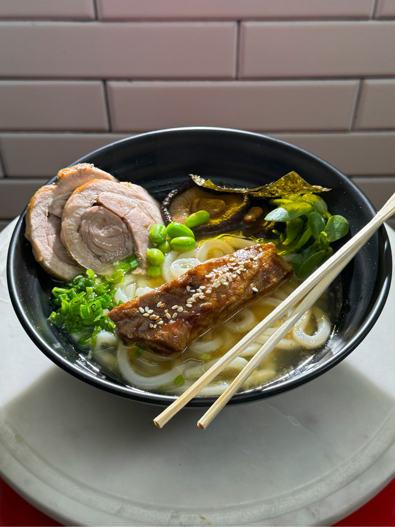 Aquí el Udon es su ingrediente estrella. Lo encuentras tanto en el ramen, como en platillos salados y dulces. La recomendación para probar es el Okonomiyaki mexa, su versión de la “pizza japonesa” pero en forma de tortilla empalmada o taco sonorense. Su Katsu Sando con crema de cacahuate y mostaza brûlée. Con pan de betabel. O su Udon Carbonara con pork belly. Además, cuentan con una carta de bebidas donde destacan sus tragos diseñados con calpis, su michelada con limonada de té marcha y piquín con alga nori o el trago de whisky que cambia de