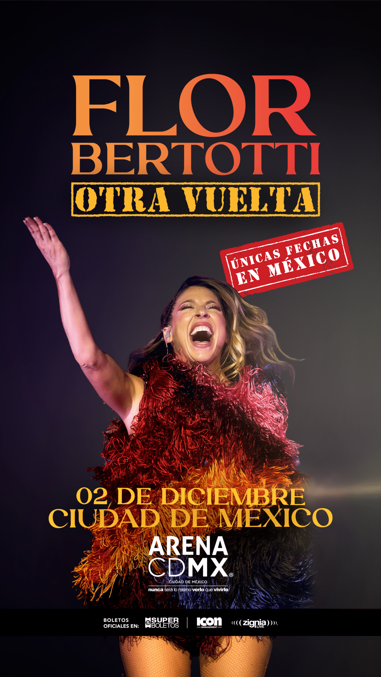 La querida artista argentina FLOR BERTOTTI regresa a nuestro país con un espectáculo imperdible que marcará un reencuentro muy esperado con su público. En el marco de su tour internacional, Flor visitará la Arena CDMX este próximo 02 de diciembre con Otra vuelta Tour, la cual desde ahora se anticipa como una noche llena de nostalgia y diversión para sus miles de fans de la capital.
