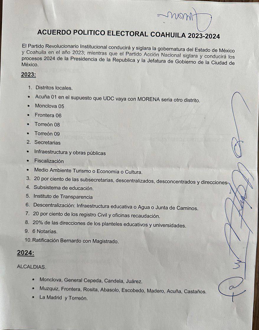 Es muy sabido que @AccionNacional sacrificó una parte de su votación por no postular a un candidato a la gubernatura. En honor a la verdad y transparencia, generando convicción plena y habiendo informado a la dirigencia nacional del PRI que lo haríamos ante cualquier incumplimiento, anexamos el acuerdo firmado por Manolo Jiménez en el cual no se habla en ninguna parte de algún porcentaje de votación.