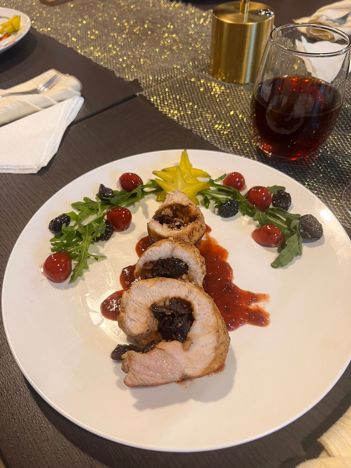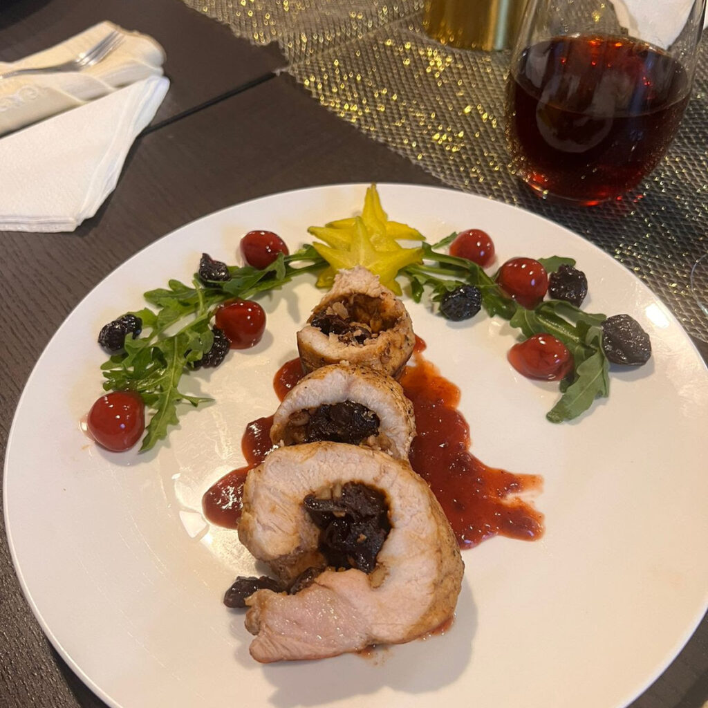 Lomo de cerdo relleno de cerezas deshidratadas y nuez en salsa de cerezas. Este platillo, con su combinación de sabores frescos, es ideal para sorprender a tus seres queridos y dejar una huella imborrable en tu celebración. La suavidad del cerdo y el toque único de las cerezas deshidratadas y la nuez se fusionan perfectamente, creando una experiencia culinaria que transformará tu Navidad en algo verdaderamente memorable.