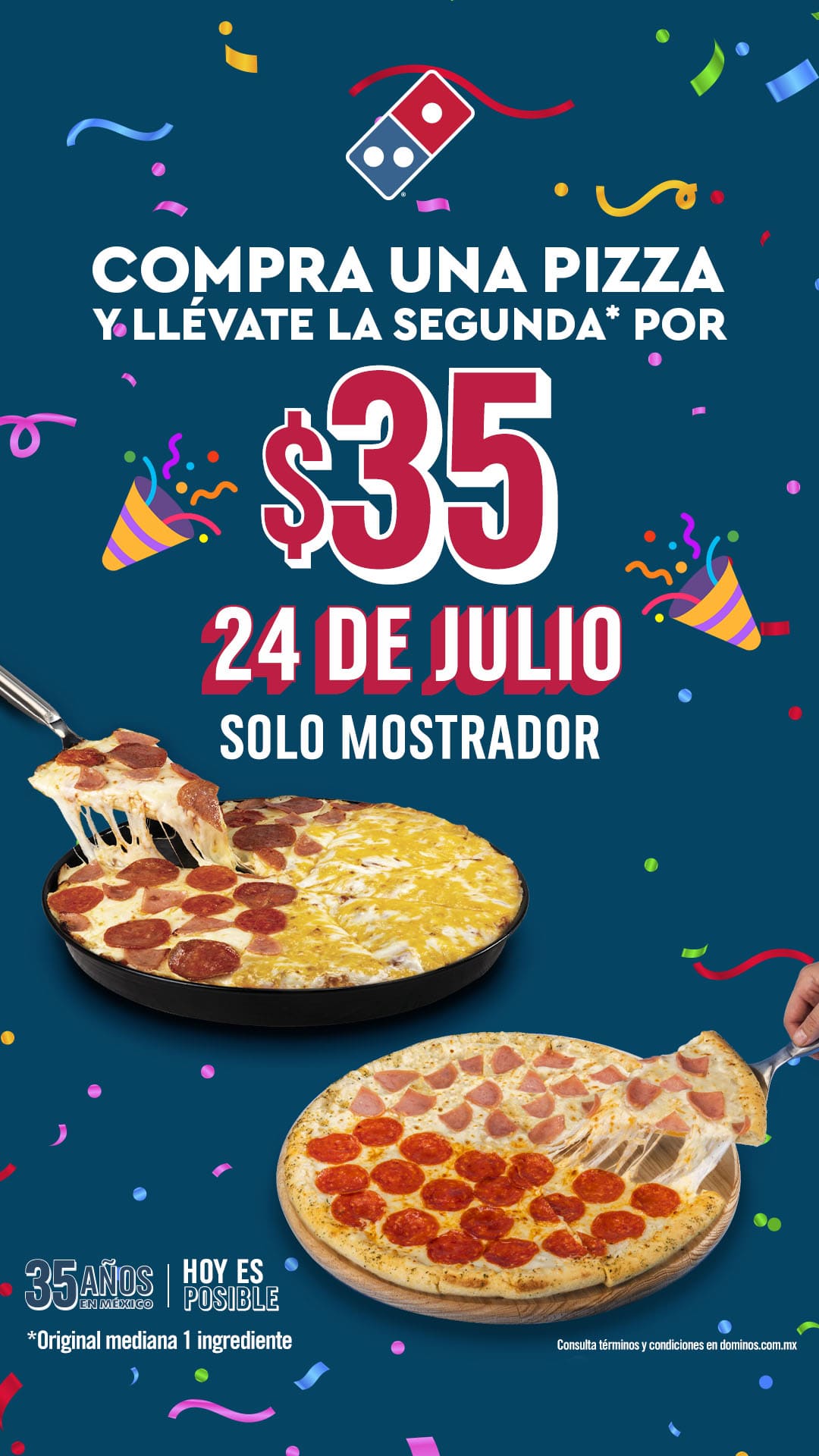 Domino’s Pizza, una de las cadenas de pizza más grandes e innovadoras en México sigue festejando con todo su 35 aniversario en México y como parte de las celebraciones, sorprende a sus consumidores con una promoción única en su historia en el país: durante el próximo miércoles 24 de julio, en la compra de una pizza, la segunda tiene un costo de $35 pesos en tamaño mediano original de 1 ingrediente al pedir por medio de la App de Domino’s para recoger en mostrador o comprando directamente en una de las tiendas de la marca. No aplica con otras promociones.