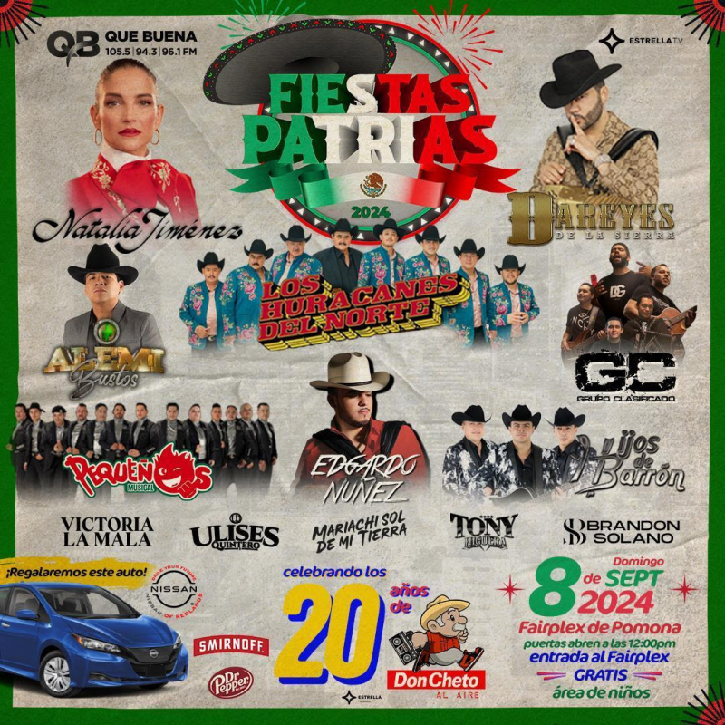 La galardonada estación de radio Que Buena Los Ángeles presentará su vigésimo concierto comunitario anual Fiestas Patrias el domingo 8 de septiembre en el Fairplex de Pomona, CA (condado de Los Ángeles). El evento se llevará a cabo desde el mediodía hasta las 8 p.m.