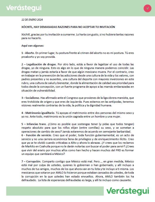 - Xóchitl Gálvez: «Lamento la decisión de Eduardo Verástegui. Respeto sus convicciones, pero creo que México necesita un cambio y estoy segura de que podemos lograrlo juntos.»
